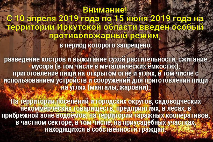 с 10 апреля 2019 года по 15 июня 2019 года на территории Иркутской области введён особый противопожарный режим, в период которого запрещено: