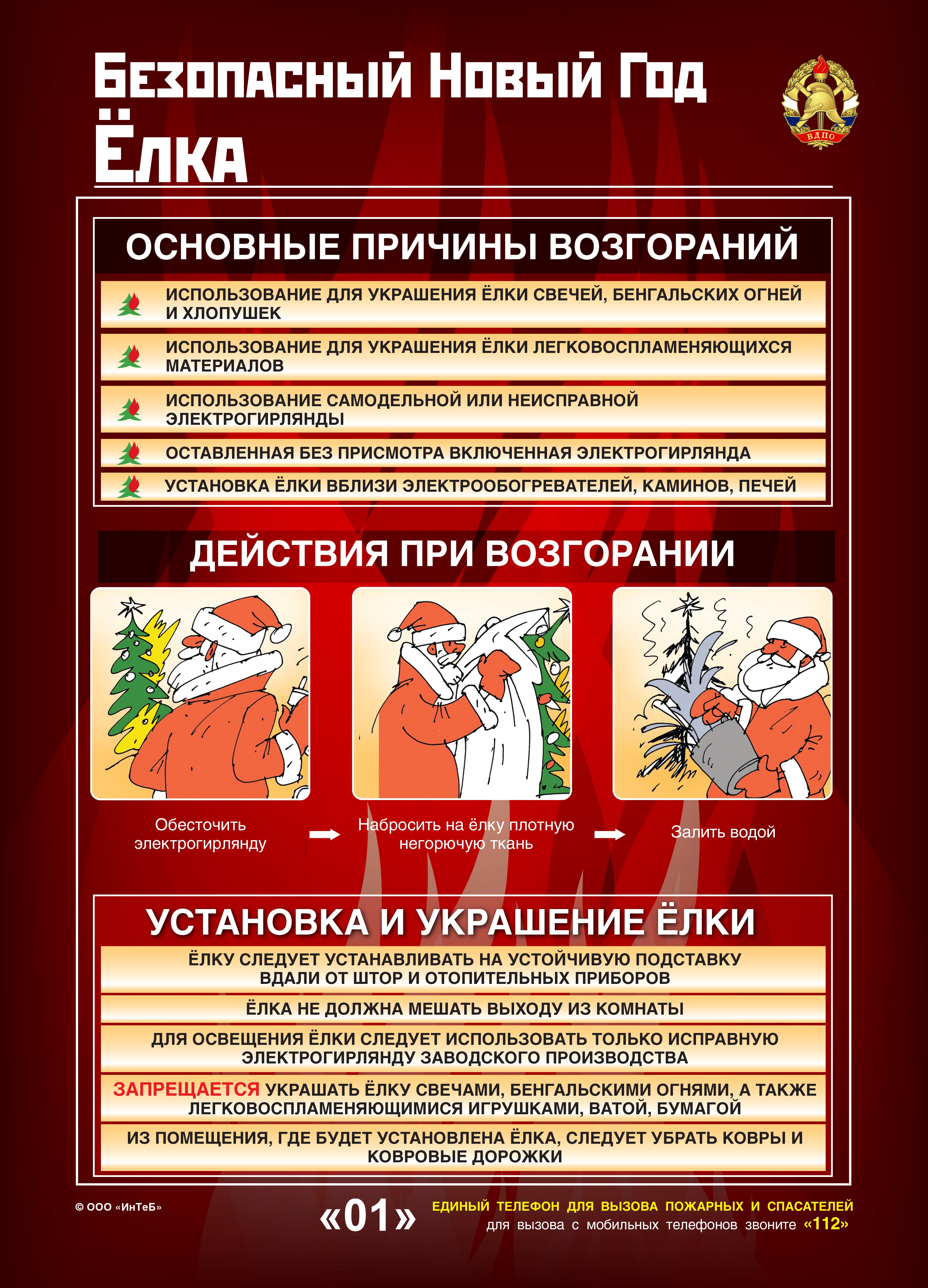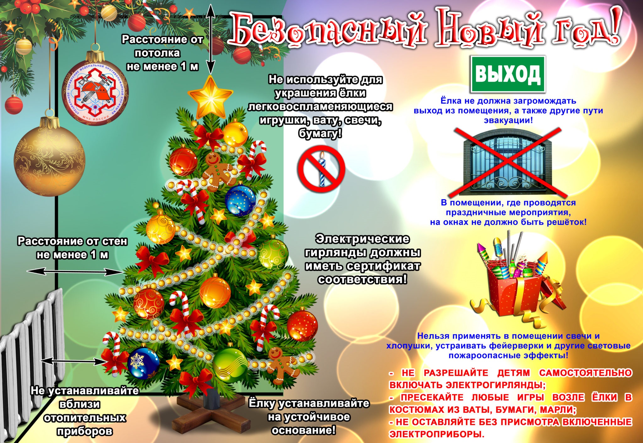 Запомните, что ёлка должна устанавливаться на устойчивой подставке, подальше от отопительных приборов, а для её освещения необходимо использовать только исправные электрические гирлянды заводского изготовления.